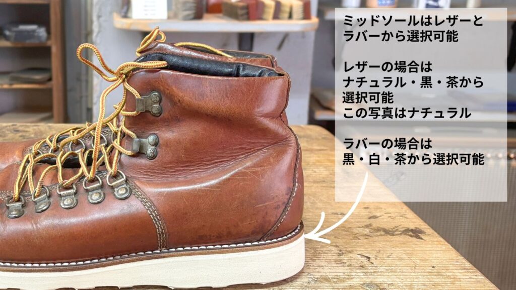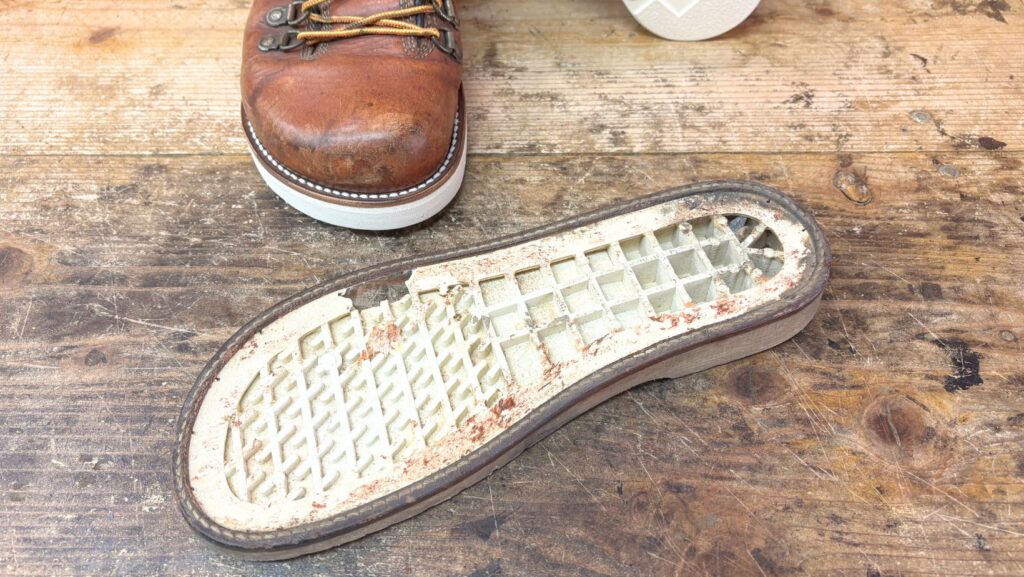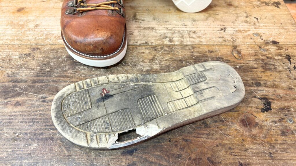 オリジナルはセメンテッド製法という製法で底付けされていました。要は接着剤で貼り付けられていたという事ですね。経年劣化により、接着剤の効きが悪くなってソールが剥がれてしまったので今回の修理となっています