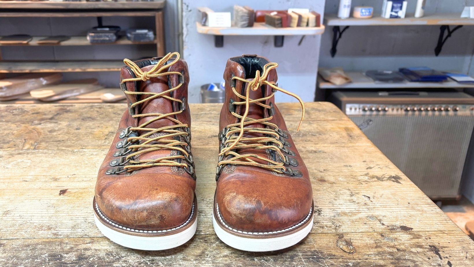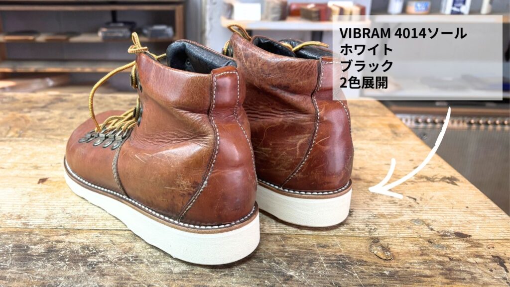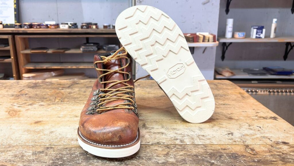 新しいソールはブラックラピッド製法という製法でしっかりと取り付けてあります。オリジナル同様の接着剤のみでの固定方法だと、また数年後に接着剤が劣化してきた時に靴底が剥がれてしまうので、今回はソールを縫い付けて剥がれがおきないようしっかり固定してあります