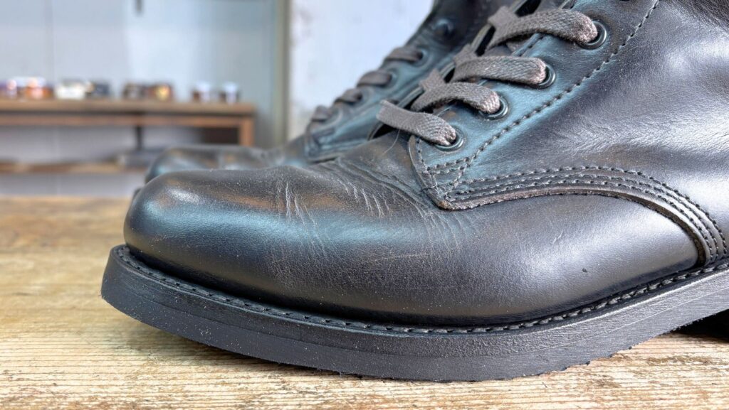 グッドイヤーウェルト製法で仕立てられたこのブーツは、丈夫なレザーアッパーと重厚な作りで知られ、しっかりと手入れをすれば何十年でも履き続けられる”一生もの”の一足。長く愛用されてきた証として、アッパーには味わい深いシワやが刻まれており、持ち主と共に歩んできた時間が伝わってきます。