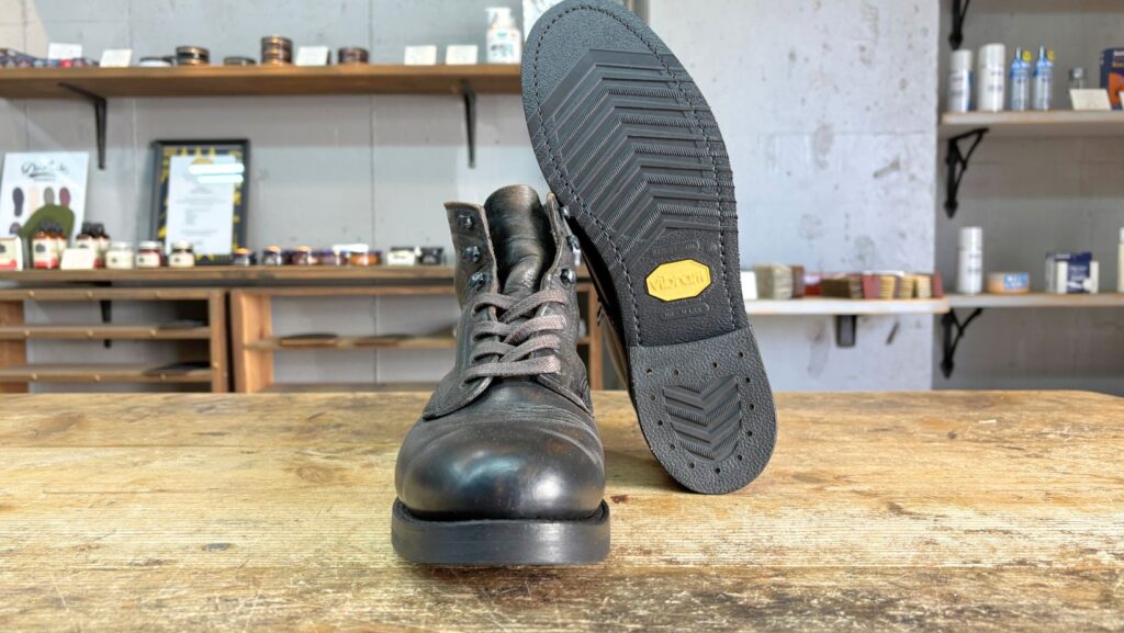 修理前はソールがすり減り、もうひと踏ん張りが難しい状態でしたが、Vibram 700に交換してリフレッシュ。アッパーの風格はそのままに、足元は新品同様の安心感が蘇りました。