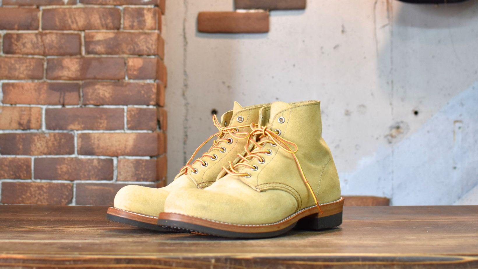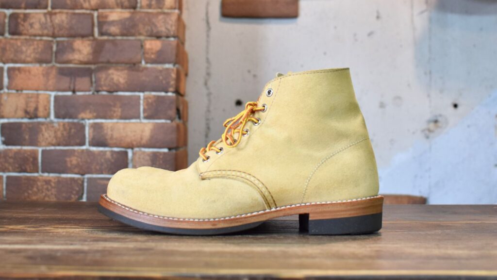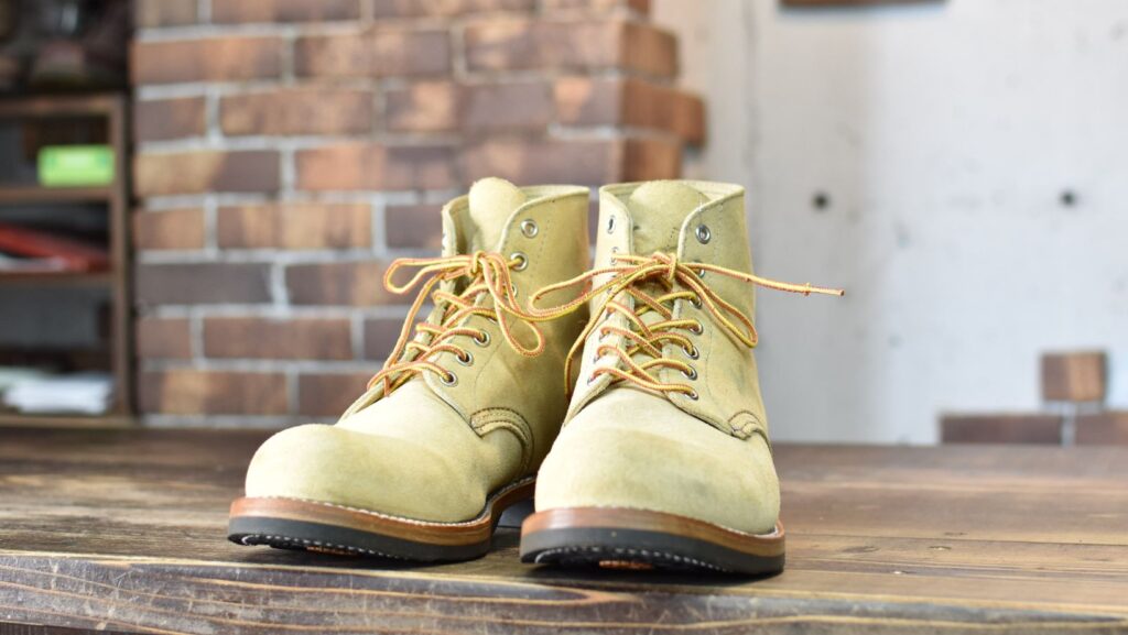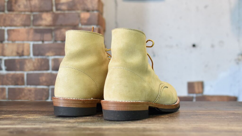 レッドウィング8167は、ホーソーン・アビレーンというタンカラーのラフアウトスエードを使った6インチのプレーントゥブーツです。ラフアウトとはレザーの裏側を表に使った起毛素材で、独特のマットな質感が特徴