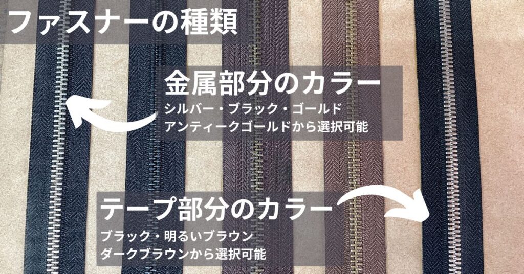 ファスナーの種類やカラーも選べる