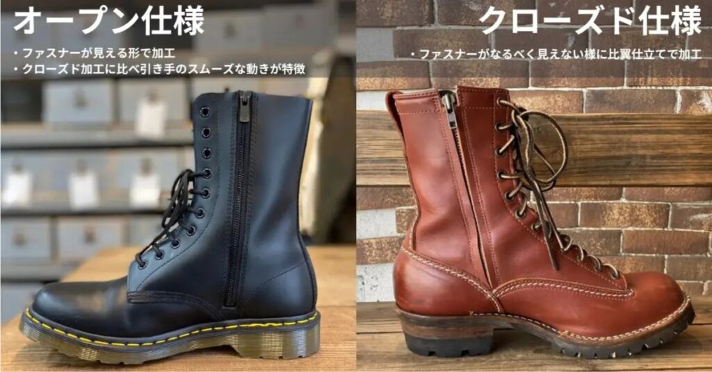 靴修理RADIANで行っている、ブーツのサイドジップカスタム。レースアップのブーツを着脱するたびに靴紐を結び直す必要がなくなり、ブーツの脱ぎ履きが圧倒的に便利に楽チンになります。
