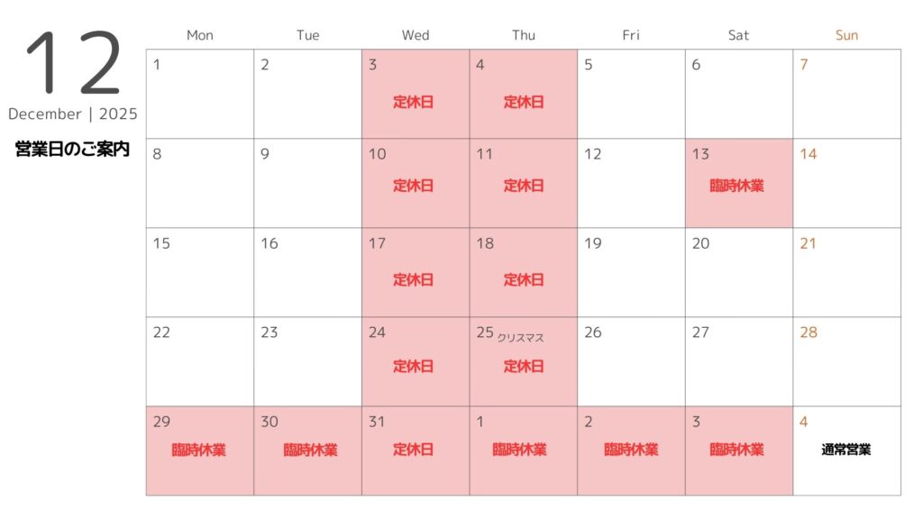 臨時休業の場合もありますので営業日カレンダーご確認の上、ご来店ください
